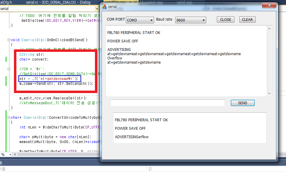 ¸¶Áö¸· ±×¸²Àº Á¦°¡ ÀÛ¼ºÇÑ MFC ÇÁ·Î±×·¥À¸·Î serial Åë½ÅÀ» ÇÑ °æ¿ì ÀÔ´Ï´Ù. º¸½Ã´Â ¹Ù¿Í °°ÀÎ serial ¿¬°áÀº ÀßµÇÁö¸¸ ÆÄ¶õ»öÀ¸·Î Ç¥½ÃÇÑ ¹Ú½º ¾È¿¡ data¸¦ Àü¼ÛÇÒ °æ¿ì µÎ¹øÂ° ±×¸²°ú °°Àº »óŸ¦ º¸ÀÌ°Ô µË´Ï´Ù.